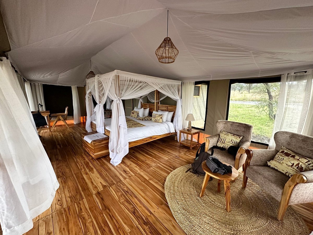 Each spacious tent combines rustic charm with modern comfort. Designed using natural materials, the tents feature cozy beds, private en-suite bathrooms, and solar-powered lighting. Step out onto your private veranda and take in the breathtaking views of the plains, where elephants, lions, and giraffes often roam nearby.