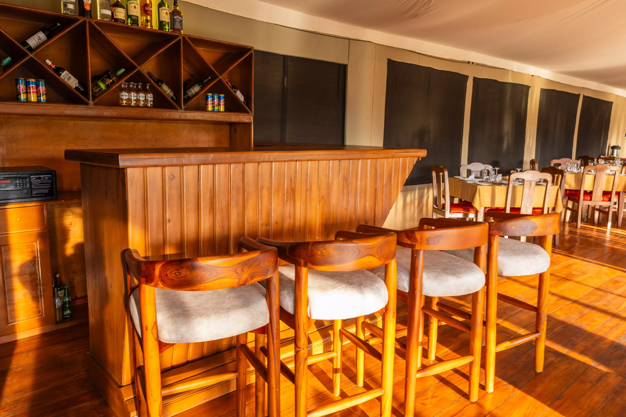 In addition, guests can unwind with signature cocktails, freshly made tonics, or a glass of wine while enjoying the soothing sounds of nature and soft evening music. The open-air dining area overlooks the sweeping plains, creating a perfect atmosphere for relaxation and connection.