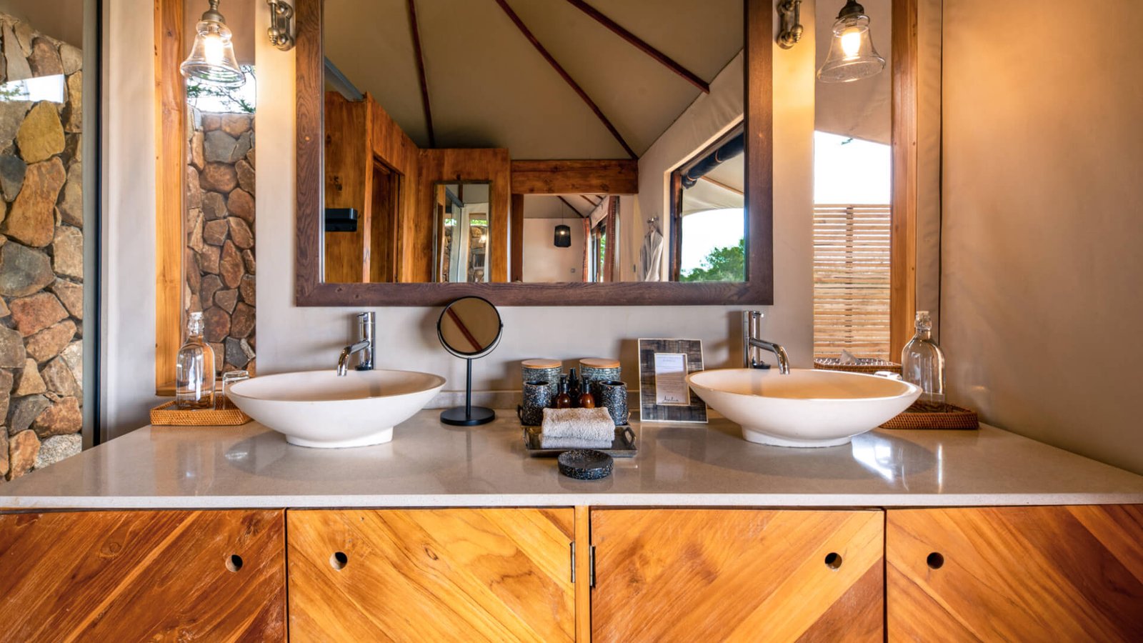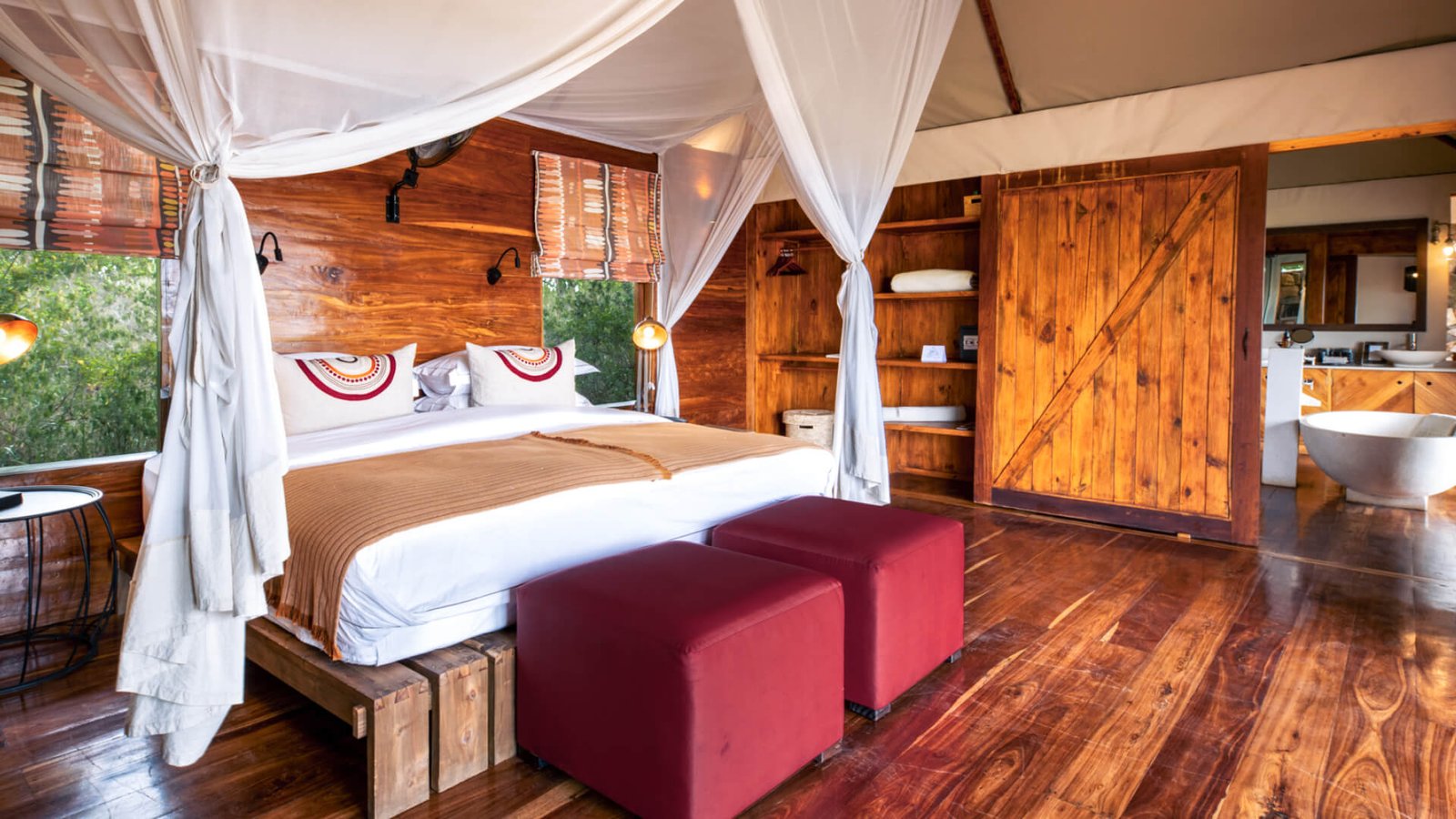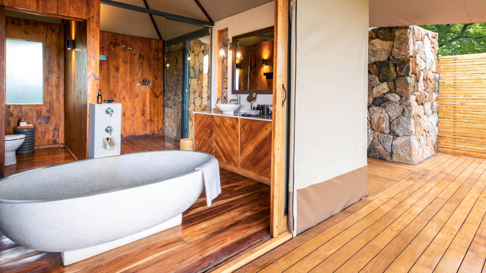 The suites are spacious, elegant, and designed with modern safari style. Each one features a comfortable bed, an en-suite bathroom, and a private deck that overlooks the sweeping landscape. You can relax in your lounge area, enjoy hot showers, or take in the warm sunset light from your veranda. The combination of natural textures and soft colors creates a peaceful and luxurious atmosphere.